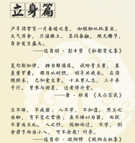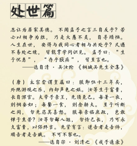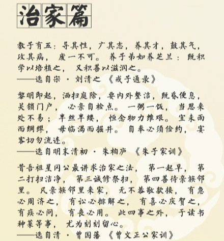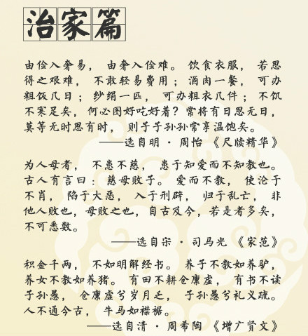中国人自古注重庭训家教,曾子杀猪教子、孟母三迁等故事至今在老百姓中耳熟能详,家训也是一个中国传统文化中的宝库。从先秦到明清,我国流传下来的家训可谓汗牛充栋,有的堪为经典。为了更好地从中国传统文化角度培育和弘扬社会主义核心价值观,促进全社会各个家庭良好家风的养成和实践,近日,人民日报推出中国古代家训集萃,有立身篇、治家篇、敬业篇和处事篇,特从立身、治家、敬业、处世四个方面选取部分经典家训,供读者参考,非常具启发性。